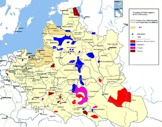 From the late 16th century the influence of the magnates on Commonwealth politics rose sharply, through their participation in the administrative system (see offices of the Polish–Lithuanian Commonwealth) and their control over the lesser nobility, which allowed them to influence the parliaments (local sejmiks and the national sejm walny) of the country.[1] From the second half of the 17th century, the magnates emerged as the victors in the struggle for power in the Polish–Lithuanian Commonwealth, leading some scholar to refer to this period as a time of the magnate oligarchy.[1] As Norman Davies noted, at that time "political life [of Poland] was reduced to the feuds, fortunes, and the follies of a few families".[5] Faced with the weakness of the king and parliament, the magnates were even able on occasion to start border wars (Magnate Moldavian Wars, the Dimitriads) or civil wars (Radziwiłł's rebellion during The Deluge, and the Sapieha's-centered Lithuanian Civil War of 1700).[1] Some magnates were also elected as kings of the Commonwealth; namely Michał Korybut Wiśniowiecki and Stanisław August Poniatowski (a relative of the Czartoryski family).[6][7]