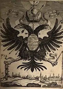 The frontispiece of the first edition is by Claudio Dagli. It depicts the double-headed imperial eagle of the Hapsburg dynasty. It hangs by a magnetised chain from the imperial crown that supports an orb and a cross. Both the crown and the cross are struck through with magnetised arrows pointing towards a heavenly source, but not directly at the all-seeing eye of god directly above - perhaps a reference to magnetic declination.[5]:23 In one of its claws the eagle holds the crowns of Austria, Hungry and Bohemia, held together by magnetism, while in the other it holds the sceptres of the three realms, similarly linked by magnetic force. Arrows from the bird's outstretched wings project imperial power to the lands below.[18] A lodestone on the eagle's breast carries the dedication to Emperor Ferdinand III and a banner above the eagle's head carries the Latin motto Regna Quis Adiunxit Regnis Nova Sceptra Coronis ("He has added kingdoms to kingdoms and new sceptres to crowns"). A second banner curling around its feet carries the Latin pun Et Boreae Et Austri-Acus (""Needle of the north and south - 'austriacus' also meaning 'Austrian').[5]:23 In the third edition the dedication to Ferdinand III is replaced on the breast of the eagle by his portrait.[5]:23