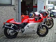 Magni offered a range of parts to upgrade MV fours. They also manufactured complete motorcycles using the parts. The specification varied from customer to customer.[22] Amongst the options were big-bore kits to bring the capacity up to 837 cc (as used on the MV 850 SS Monza),[23] Dell'Orto carburettor kits,[24] exhaust systems, drive chain conversions,[5] the lightweight Magni frame, which was based on Magni's design for the F750 S Imola racer,[5] EPM wheels, 4ls drum brakes and Brembo disc brakes.[25]