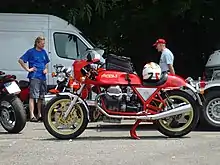 Magni wanted to produce an "all Italian" machine and turned to Moto Guzzi for a supply of engines. The first Guzzi engined machine was the Magni-Guzzi LeMans 1000, using the engine from the Le Mans 1000. A new frame was designed, which had similarities to the Lino Tonti designed Moto Guzzi item. Magni introduced the "parallelogram" rear suspension,[33] previously used on the 1950 shaft drive MV Agusta 500 cc GP machines,[35] which negated the torque reactions of the shaft drive and made the handing more predictable.[30][36] (A parallelogram kit was made available to upgrade the rear suspension of Moto Guzzi models)[37]