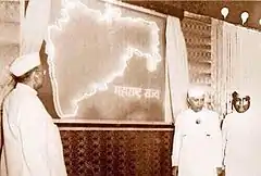 Jawaharlal Nehru, Yashwantrao Chavan and Sri Prakasa unveiling a map of the new state of Maharashtra at Raj Bhavan, Mumbai, on 1 May 1960