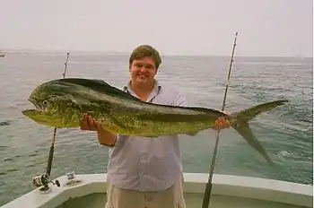 Mahi-mahi are swift and acrobatic game fish with striking colours. These colours darken when the fish dies (see illustrations)[1] The current IGFA all tackle record is 39.91 kilograms (88lb), caught in 1998 in Exuma, Bahamas by Chris Johnson of Lake Mary, Florida.[2] Catches average 7 to 13 kilograms (15 to 29 lb), and any mahi-mahi over 18 kilograms (40 lb) is exceptional. Males are often larger than females.