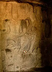 Mahishasuramardhini Mandapa (Cave Temple; also known as Yampuri)[1] is an example of Indian rock-cut architecture dating from the late 7th century, of the Pallava dynasty. It is a rock-cut cave temple located on a hill, near a lighthouse, along with other caves in Mamallapuram. Mamallapuram, also popularly known as Mahabalipuram, is a small village to the south of Chennai, in the state of Tamil Nadu, India.[2] The temple is part of the Group of Monuments at Mahabalipuram, a UNESCO World Heritage Site inscribed in 1984.[3] This Cave Temple has many interesting architectural features of which three exquisitely carved reliefs on the cave walls of three sanctums are prominent. One is of Vishnu reclining on the seven hooded serpent, Adishesha, another of Durga, the main deity of the cave temple Durga slaying the buffalo headed demon Mahishasura, and the third sanctum has a sculpture of Shiva.[4][5]