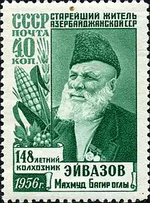 ![]() Eyvazov on a postage stamp of the USSR, issued to mark his supposed 148th birthday.[1] | |