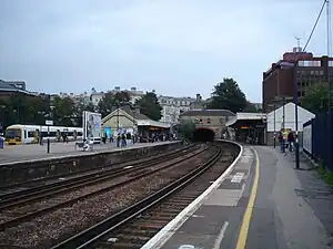 The goods yard comprised ten sidings on the down side and two on the up side. There was a goods shed and a 10-ton capacity crane. West of the high-level bridge, a siding on the down side served a corn mill. In 1939, this siding was electrified to provide berthing siding for electric multiple units. In 1882, the Midland Railway opened a coal depot at the station. Their successor, the London, Midland and Scottish Railway sold the depot in 1934, although it continued to be used for that purpose. Freight services at the station were withdrawn on 13 September 1965.[5] A small locomotive depot was located on the up side. It closed in 1933. During the 1960s Tony Hocking was a booking clerk at the station, locally famous for invariably having a bottle of Vimto visible on the desk despite this being in contravention of the strict railway bylaws of the era. [6] On 2 August 2015, a fire damaged some of the station buildings.[7] Part of the main goods yard was formerly a Royal Mail sorting office. The remainder is a car park for station users. A short siding from the down line to the west of platforms 2 and 3 is a remnant of tracks into the yard. The site of the up goods yard is now a car park.