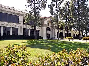The Main Building, built in 1917, was the first building on the campus, then known as the Torrance School and serving all grades.[2] It is a two-story structure designed in the Mediterranean Revival style, and has architectural elements in the Classical Revival and Spanish Colonial Revival styles.[2] The central two-story section is flanked by one-story wings, which all frame an outdoor courtyard patio.[2]
