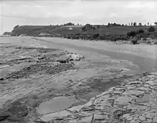 After Big Murrays Bay was renamed Murrays Bay in 1900, locals created petitions to suggest new names. A local solicitor, Mr. Rennie, suggested Awatea Bay, but the name Mairangi Bay, based on the Māori name Ōmairangi, was successful.[14] Mairangi Bay was sold and subdivided in 1912.[14] After the Murrays Bay Wharf was constructed in 1916,[28][32] Mairangi Bay became a popular spot for holidays and day trippers from Auckland, who arrived by ferry.[33] Housing developed in Mairangi Bay in the 1920s, primarily used as holiday homes.[32] The Mairangi Bay post office opened in 1930, and the first shops and local services began operating from the 1930s and 1940s.[32] During World War II, pillboxes were constructed at Mairangi Bay in various locations: at the beach, on the clifftops to the south of the suburb, in the modern-day Mairangi Bay School grounds, Elizabeth Place and on Kowhai Road. A searchlight emplacement was constructed at Whitby Crescent, as well as an anti-tank stone wall.[34]