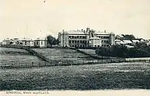 The Immigrants Home was founded by Caroline Chisholm in East Maitland and was the first public building that was used to treat the sick.[26] The site eventually became known as Maitland Benevolent Asylum.[26] In 1835, when the population hit 1900, residents started to petition for a new hospital.[26] In 1843 a meeting was called to discuss applying to Benevolent Asylum in Sydney.[26] A committee was formed and succeeded in obtaining a grant of £1000 for a new hospital on 5 December 1844.[26] In April 1845 Sir George Gipps approved a grant of a site at Campbell's Hill, West Maitland opposite Boyne's Inn.[26] The foundation stone was laid by Edward Denny Day on 26 January 1846.[26] In April 1846 the foundation stone was removed and was never recovered.[26] In September 1847 the Building Committee announced that plans for the building of the new hospital would be accepted.[26] The cost of the building was not to exceed £2000 and fifteen guineas would be awarded to the party furnishing the approved plan.[26] By May 1848 the Maitland Mercury was reporting that the walls of the new hospital were visible from the town.[26] Opened in 1850 its first years saw 231 patients and 26 deaths.[26] Between 1903 and 1905 saw the completion of the Ward Block 1 at the southern end of the hospital.[27] With the growth of population in the district, it was found that the accommodation was inadequate and a new building was erected and opened in 1905.[26] In 1916 a blood bank and isolation cottage were completed.[27] In 1926 the hospital became a training school for nurses.[27] New nurses' quarters which occupied the site of the old Royal Oak Hotel was built during the twelve months from October 1927 to October 1928.[26] In the 1930s Ward Block 3 was built and extensions were completed to the nurses home in 1932 and 1937.[27]