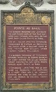 In 1760, the French were forced to leave their fort at Pointe au Baril when British troops invaded. General Amherst captured the fort as well as both ships.[4] The site was left abandoned for around 20 years; the British made no attempt to settle here initially or colonize the area. By the time the Loyalists arrived around 1784, there was little to no evidence of the French settlement or fort, all that remained was a log building which had once been used as officers’ quarters.[4] The approximate site of the fort was designated a National Historic Site of Canada in 1923, and is marked by a stone cairn.[5][6]
