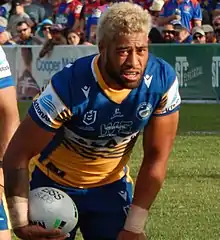 Makatoa joined the Parramatta Eels' New South Wales Cup squad in 2020, again under coach Carr.[9] In Round 22 2021, Makatoa made his NRL debut for Parramatta against the Manly-Warringah Sea Eagles at Sunshine Coast Stadium, which ended in a 56-10 defeat.[10] In December 2021, he signed a new deal to remain at Parramatta until the end of the 2023 season.[11] Makatoa played 23 games for Parramatta in the 2022 NRL season including two finals matches. Makatoa was left out of Parramatta's preliminary final team which defeated North Queensland to reach the 2022 NRL Grand Final. Makatoa was not included in Parramatta's grand final team which lost 28-12 against Penrith.[12] In round 16 of the 2023 NRL season, Makatoa scored his first try for Parramatta in their 34-4 victory over Manly.[13] Makatoa played a total of 17 matches for Parramatta which were all from the interchange bench in the 2023 NRL season as the club finished 10th and missed the finals.[14]
