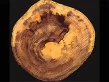 Symptoms normally appear early in the spring as chlorosis of the shoot and leaf vein. There is also epinasty, or bent out and downwards, of the young leaves in the spring. This is followed by wilt and die back of leaves, twigs and branches.[2] In most cases dieback is sectorial.[3] Symptoms start out by resembling frost damage of the leaves and gradually progress to leaf and stem dieback. A salmon, pink, or red color develops in the wood due to the xylem producing a gum to prevent further damage. Flask shaped pycnidia are barely visible as black spots in the center of grey areas though hard to distinguish due to their placement in cortical tissues. Pycnidia are not arranged in a distinguishable pattern instead they are scattered sporadically. Severity of disease and symptoms depends on the age of a tree. The inoculum is spread more efficiently when the roots are infected versus a leaf infection. Often only a certain section of the canopy is infected until it gradually progresses basipetally.[2]