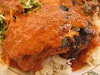 Traditional cooking methods in Malay cuisine are quite similar to life in Malay villages, slow and relaxed, as most Malay food is cooked on low heat for a long time compared to Chinese food.[10] There are numerous methods of cooking which consist of dry and moist methods.[11] Tumis (using a small amount of oil or fat in a shallow pan over relatively high heat), salai (food smoked or grilled with the ingredients often cut into pieces or thinly sliced to facilitate fast cooking), sangai (food, mainly dried spices, fried without oil), and layur (warmed over low heat to dry) are examples of terms for dry-heat cooking methods. On the other hand, moist-heat cooking methods includes terms such as tanak (cooking in a pot, especially rice), jerang (boiling or simmering), celur (blanching or dipping food such as vegetables into hot water) and reneh (simmering or boiling food).[12]
