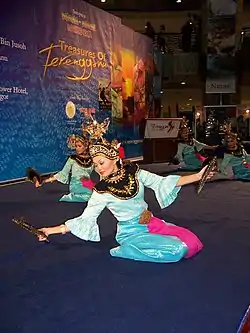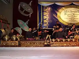 Malay gamelan was first introduced to the public when Tan Sri Mubin Sheppard, a Malay architectural scholar, found a gamelan set at the Pool Terengganu Palace and then asked Tengku Ampuan Mariam's permission to turn on this gamelan in 1966.[15] The first appearance of the Gamelan Orchestra in Raja Terengganu was in 1969 at the Asian Music and Drama Festival at Universiti Malaya (UM) Kuala Lumpur followed in 1970 in conjunction with Temasha Seni Melayu which also presented a new generation of dancers. Since then, it has become a part of the Malaysian arts and cultural heritage. Gamelan is commonly played during formal occasions like weddings and traditional ceremonies.