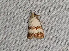 The wingspan is about 20 mm. Adults have white forewings with two brown bands. The hindwings are pale brown with darker margins.[3]
