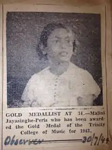 Among the many awards she received in Sri Lanka were the Gold Medal from the Trinity College of Music London and the Gold Medal from the Associated Board of the Royal Schools of Music London[6] as well as their diplomas for performance. At the Royal College of Music she was awarded the Herbert Fryer Prize, the Marmaduke Barton Prize, and the Hopkinson Silver Medal along with her performance diploma of ARCM.