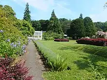 The garden is open to members and paying visitors and consist of a 3-acre (12,000 m2) walled garden set in approximately nine acres of woodland.[8][4][9] The gardens feature four 100-year-old yew trees known as the Four Apostles and was home to Scotland's National Bonsai Collection, which left around 2000 and is now located at Binny Plants near Ecclesmachan.[10] The house is not open to the public.[8] The garden was celebrated in the 17th century for their Dutch-style of gardens.[3] There are over 150 varieties of roses at Malleny, including the National Collection of 19th century Shrub Roses, as recorded by the National Council for the Conservation of Plants and Gardens.[3] The current layout of the garden dates from the mid to late 19th century.[9] The gardens contain two old Victorian glasshouses.[9]