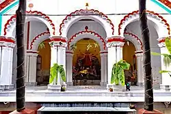 Among the notable architectural standards are the palace, built in the neoclassical style, and the Durga Dalan, constructed in the Do-Chala pattern of the Vaishnavite temples of Bishnupur. Apart from these, there are twelve Shaivite temples dedicated to the Hindu God Shiva at Shibbajar, a Rasmancha, site of the famed Ras Purnima celebrations of the palace, and a few water bodies and canals constructed by Janmenjay Mallick.[10] In 1878, one of the district's first theatrical performances was held at the Natmandir, constructed in the at-chala style of temple architecture, within the palatial quarters. This was also for the first time that the foot-light technique had come to be used in dramatics.[11] Among the most prominent personalities who advocated for and regularly patronised dramatics were Chowdhuri Kumar Joggeshwar Mallick and Chowdhuri Kumar Jogendranath Mallick, brothers of Chowdhuri Zamindar Jamini Mallick Bahadur. Two of the first dramatic performances - ‘Ramabhishek’ and ‘Pravabati’, were organised by their theatrical association, which also included several Magistrates and Zamindari Rajas, and was patronised by Sir Nilratan Sircar.[11]
