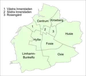 After a reform on 1 July 2013, Malmö Municipality is divided into five city districts (Swedish: stadsområde).[5][6] They manage public kindergartens, schools, and geriatric care within their geographical areas, and provide funds for local cultural and recreational activities.
