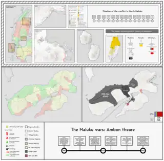 The principal causes of the conflict are attributed to general political and economic instability in Indonesia following the fall of Suharto and the devaluation of the rupiah during and after a wider economic crisis in Southeast Asia.[2] The forthcoming division of the then Maluku province into the current Maluku province and North Maluku province exacerbated existing district political disputes further[3][4] and, as the political dispute had been characterized along religious lines, inter-communal fighting broke out between Christian and Muslim communities in January 1999, cascading into what could be described as all out warfare and atrocities against the civilian population committed by both sides.[5] The main belligerents were therefore religious militia from both faiths,[6] including the well organised Islamist Laskar Jihad,[7] and Indonesian government military forces.[8]
