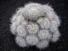 This plant is variable, but most clump though some are solitary. This plant has long white spines at the end of the conical tubercles that distinguish Mammillarias. Between these tubercles is white wool. [1]
