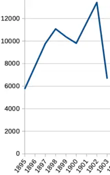 By 1902 the staff had increased to 6, the tickets to 13,425 and 1,726,600 board feet (4,074 m3), or superficial feet of timber were railed from Mangaonoho that year.[17] Mangaonoho didn't feature in revenue statements after 1904, when the staff was down to 1,[18] though 6,662 tickets had been sold in 1903, but only 33,000 board feet (78 m3) of timber were railed out.[19]