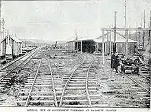 Mangaonoho Public Works Department workshop opened in 1896,[20] 1.37 km (0.85 mi) to the north of the station,[21] on what was Waterfall Rd[22] (now Ironworks Rd),[23] where a passing loop for 67 wagons[3] remains.[24] The works was fully operational from late 1898. Electricity lit the track and workshop to allow 16-hour working days. All the steelwork for the Makōhine Viaduct was ready in 1900. Up to 300 were employed in building the viaduct. Two of them died in accidents.[20]