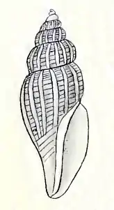 The white shell has a fusiform shape. It is turriculate, distinctly axially costate and with fine spiral threads. The siphonal canal is very narrow. The sculpture consists of close straight rounded and prominent axial ribs, about 18 on the body whorl. The interstices have about the same width as the ribs, which are obsolete on the lower part of the base, flexed and less prominent on the shoulder. The surface is crossed by equidistant spiral riblets, separated by linear grooves, rubbed off on the top of the ribs, much finer and dense on the shoulder. The colour is yellowish-white. The spire is conic, turreted, of the same height as the aperture. The protoconch consists of about 2 whorls. The nucleus is smooth, convex, slightly lateral, the second whorl convex, and minutely reticulated. The 6½ subsequent whorls are distinctly shouldered, flatly rounded below the angle. The base is much narrowed. The suture is impressed and submargined. The aperture is oblique, very narrow, angled above, narrowed and drawn out to a short siphonal canal below. Its base is not notched. The outer lip is thickened by the last rib, angled above, then moderately convex, with a shallow sinus below the suture. The columella is vertical, straight, excavated on meeting the faintly convex parietal wall. The inner lip is narrow and thin.[1]
