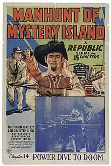 Manhunt of Mystery Island is a 1945 science fiction movie serial. It was the thirty-sixth serial produced by Republic Pictures (of a total of sixty-six) and the first released in 1945.[2]