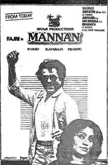Mannan (transl. Monarch) is a 1992 Indian Tamil-language masala film[1] written and directed by P. Vasu. The film stars Rajinikanth, Vijayashanti and Khushbu. It is a remake of the 1986 Kannada film Anuraga Aralithu, which in turn was based on the novel Anuragada Anthapura by H. G. Radhadevi. The film was released on 15 January 1992 and ran for over 25 weeks in theatres.