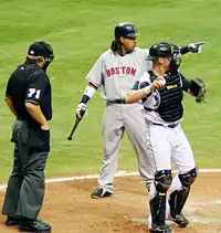 A heated altercation between Ramirez and teammate Kevin Youkilis took place on June 5, during a game at Fenway Park against the Tampa Bay Rays.[59] The Boston Globe speculated that Youkilis was angry that Ramirez had been slow to join a bench-clearing brawl earlier in the game. The altercation may have also been caused by Ramirez objecting to what he believed was excessive complaining by Youkilis about the strike zone, as well as the first baseman's penchant for sometimes throwing his helmet in frustration after making an out.[60][61] Before the fifth inning, Ramirez was caught on NESN cameras taking a swing at Youkilis.[59] Ramirez and Youkilis yelled at each other and had to be separated by teammates, coaches, and training staff. Youkilis headed out to the field still yelling at Ramirez, while Ramirez was escorted into the tunnel leading to the clubhouse by bench coach Brad Mills and trainer Paul Lessard.[59]