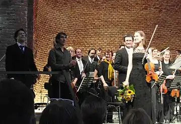 The composer applauding conductor Manuel Nawri (left), violinist Henja Semmler and the Nymphenburger Kammerorchester after the premiere of Bright Blue Bird, In A Grey Red Sky at the Allerheiligen-Hofkirche, Munich, on 22 June 2014