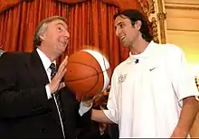 Emanuel David Ginóbili Maccari (English: /ˈmænuː dʒɪˈnoʊbli/ MAN-oo jih-NOH-blee,[3] Spanish: [ˈmanu ʝiˈnoβili];[4] born 28 July 1977[5]) is an Argentine former professional basketball player. Widely credited for changing the game of basketball by popularizing the Euro step move in the NBA,[6][7] he is regarded as one of the greatest shooting guards and sixth men in the league's history and as the greatest Latin American player of all time. He notably led Argentina to a gold medal in the 2004 Athens Summer Olympics.[8][9][10][11][12][13][14][15] Over a 23-year professional career, he became one of only two players (along with fellow Hall of Famer Bill Bradley) to have won a EuroLeague title, an NBA championship, and an Olympic gold medal.[16] A four-time NBA champion, Ginóbili was a member of the San Antonio Spurs for his entire 16-year NBA career. Along with Spurs teammates Tim Duncan and Tony Parker, he was known as one of the "Big Three" during the Spurs' era of success. During their playing years together, the Spurs became a "model franchise" for other NBA teams. Since September 2021, Ginóbili had been appointed as special advisor to Basketball Operations for the San Antonio Spurs.