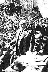 Some time in 1920 Simó joined the Mellistas. He was among representatives of "tendencia praderista del mellismo", i.e. he opted for a broad centre-right alliance instead of a far-right amalgam.[92] However, this vision was increasingly saturated with Christian-democratic flavor.[93] In 1921 he was elected to Diputación Provincial,[94] the ticket renewed 2 years later.[95] In 1922 Simó with Angel Ossorio y Gallardo, Salvador Minguijón and Severino Aznar launched Partido Social Popular.[96] Since it denounced the political regime of restauración as non-functional, they abstained in the 1923 elections.[97] Jeered by both Mellistas[98] and Jaimistas,[99] Simó mobilized support for the newly emergent party at public rallies in the summer[100] and fall of 1923.[101] The military coup of Miguel Primo de Rivera changed political setting in Spain. PSP leaders initially seemed to have welcomed the change and the party executive kept meeting also in December 1923;[102] once the dictatorship brought political life to a standstill, the party disintegrated.[103]