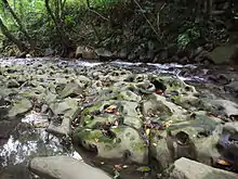 A prior theory states that the former name (Chinese: 皺空; Pe̍h-ōe-jī: jiâu-khang; lit. 'roughness-holes'; also 皺孔; jiâu-kháng) refers to pothole formations. A recent publication suggests that the valley area was overrun with masked palm civet and hence its former Hokkien name (貓面; bâ-bīn; 'cat surface'). During Japanese rule the name was recorded as Bakan (Japanese: 猫空),[2] which in Hokkien could be read bâ-khang, likely referring to the presence of the civets () in the valley (khang).[3]