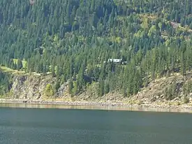 In the immediate vicinity were the Cedar View Cabins dating at least from the late 1940s.[67] By the early 1960s, the lakeshore property included a large motel unit, eight cottages, a campground, and store.[68] By the early 1980s, the site was called the Kingbaker Creek Resort.[69] By the mid-aughts, 25 campsites and five cabins existed.[70][71]