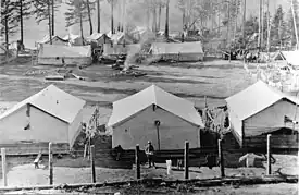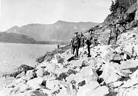The wagon road along the western side of Mara Lake having been destroyed, interned aliens built sections of a new road along the eastern side during World War I.[97] The camps, which operated June 1915–July1917,[98] spent winter at Two Mile and summer at Six Mile. Rolf Wallgren Bruhn was the road superintendent. The shore road along the southern part of the lake was blasted through rocky cliffs, with rock removal and grading by hand.[61] A commemorative marker exists about 40 metres (131 ft) south of the Wolfe Rd junction. The Hummingbird Beach Resort at Swansea Point now occupies the former camp site.[99]
