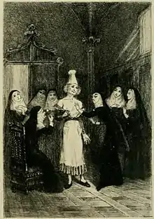 Montifaud did not shy away from addressing sexual themes in her writing, even in the context of histories of the church. In addition, she had a worldview that scholar Wendelin Guentner characterizes as "profoundly spiritual, though unapologetically pagan."[6] The prevalence of such themes in her writing caused her to be condemned as pornographic or anti-clerical by the French authorities, leading to censorship of her works and legal charges of indecency. She was required to change the title of her first publication to eliminate the word "courtesans."[2] She was fined and even imprisoned for four of her works.[4] She was sentenced to eight days in Saint-Lazare, a women's forced-labor prison, as punishment for "offense to public decency" in her publication Alosie, or The Loves of Madame de M.T.P. (1876), a re-publication of a work by Pierre-Corneille Blessebois.[2] She managed to escape to Brussels and was able to convince the authorities to convert the sentence into a stay in a mental hospital, Maison Dubois. The following year she published Les Vestales de l’Église (The Vestal Virgins of the Church), which earned her another sentence at Saint-Lazare, this time for three months. She once again persuaded the court to carry out the sentence at Maison Dubois. Throughout these trials, she argued that she was being treated more harshly than her male literary counterparts such as Charles Baudelaire or Gustave Flaubert who were charged with the same offense.[2]