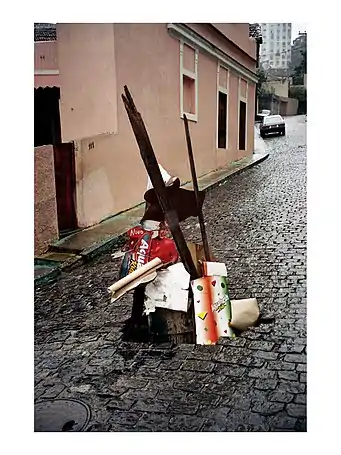 For the last three decades, Marcos Chaves has been photographing the holes in Rio de Janeiro's streets and the ready-made sculptures they become when residents fill them up with objects as a warning for pedestrians and cars. It is an ongoing cartographic and archival project about the city, photography, sculpture and street interventions—all at once. A map of the city could be generated from this methodical archive, resembling the process of an urban anthropologist, extracting meaning and sense from the city's urban fabric and the way its users inhabit it or fill its holes...[8][9]