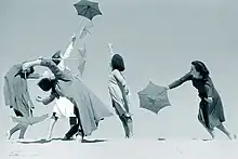 Barr drew on various dance traditions in her choreography, including some classical ballet poses and movements of the legs[36] and folk dances.[1] She also incorporated everyday movements[37] and gymnastics.[33] Depending on the concepts being conveyed, dancers sometimes moved all or part of their bodies in one place,[36] held positions,[36][33] or travelled across the stage, walking, running, jumping, shuffling or crawling.[36] Gestures of the head, arms and upper torso signified communication or emotions.[36] Lifts, balances and use of props to achieve height might signify conflict,[36] dominance,[38][39] or celebration.[36] As reviewers noted, to Barr, "Modern dance ... is always about something",[37] and her choreography was "free in movement, yet giving every movement meaning".[40]
