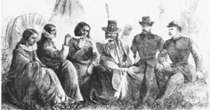 Margaret Poisal Adams with Arapaho chiefs at the Medicine Lodge Creek treaty council, 1867. Margaret (1834 to ca. 1884) was the interpreter for Little Raven and other chiefs. She was the Arapahos’ interpreter at the 1865 treaty council. The participants are smoking a pipe to sanctify the proceedings. Sketch by Theodore R. Davis, "Medicine Lodge Creek Treaty of 1867", Harper's Weekly, June 2, 1867, National Anthropological Archives, Smithsonian Institution