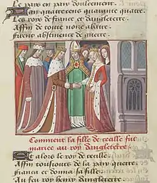 Margaret met with English envoys at Tours on 4 May 1444 to discuss her marriage to Henry VI of England.[7] On 24 May, she was formally betrothed to Henry by proxy. Her uncle, Charles VII of France, who may have suggested the marriage as part of peace efforts between France and England near the conclusion of the Hundred Years' War, was present.[7][9] The marriage was negotiated principally by William de la Pole, Duke of Suffolk, and the settlement included a remarkably small dowry of 20,000 francs and the unrealised claim, via Margaret's mother, to the territories of Mallorca and Menorca, which had been occupied for centuries by the Crown of Aragon.[10] The marriage settlement also contained the promise of a twenty-three-month truce with France.[6][10] Opinions were mixed as to the wisdom of the marriage,[11] but the prevailing understanding was that it represented a genuine effort at peace.[6]