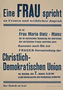 ![]() Announcement poster for a CDU women's assembly with Maria Dietz on the occasion of the 1949 federal elections | |