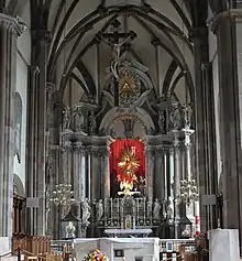 A large part of cathedral treasure, which consists of numerous goblets, monstrances and vestments, is housed in the Cathedral Treasury Bozen since its construction in 2007 in the neighboring provostry.[19] The once significant manuscript collection has been lost, which, according to inventories of the late 15th century, comprised nearly 40 liturgical manuscripts and texts of the Holy Scriptures.[20] The extensive book inventory with more than 10,000 works of 15th to 19th century however has been preserved.[21] Numerous early prints of the collection go back to the Bavarian humanist Erasmus Fend (also called Fendt or Vendius).[22] The parish church of Bozen was also an important center for cultivation of music in the 15th century.[23]