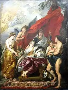 While this cycle was one of Rubens's first great commissions, Marie de' Medici's life proved a difficult one to portray. Rubens had the task of creating twenty-one paintings about a woman whose life could be measured by her marriage to Henry IV and the births of her six children, one of which died in infancy.[11] At this time, women did not in general receive such laudatory tributes, although Rubens, if anyone, was well equipped for the job, having a great respect for "the virtues of the opposite sex", as seen in his commissions for the Archduchess Isabella.[11] Furthermore, unlike her husband, Marie's life was neither graced with triumphant victories nor punctuated by vanquished foes.[11] Rather, implications of political scandal in her life made any literal depiction of the events far too controversial for Rubens to execute without incurring the disapproval from others in government.[12] Far from failing, Rubens demonstrated his impressive knowledge of classical literature and artistic traditions,[13] by using allegorical representations to both glorify the mundane aspects and sensitively illustrate the less favorable events in Marie's life. During the sixteenth and seventeenth centuries iconography of the Christian world, as well as that of the Greek and Roman pantheon was understood by well-educated artists and citizens alike, and a familiar device used in artistry.[14] Rubens painted extravagant images of the Queen Mother surrounded by ancient gods and at times even deified her using these devices. The ambiguity of the figures was essentially used to depict Marie in a positive light.[15]