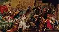 The Henry IV cycle was planned to be composed of scenes from the king's military career. The violence of these images would contrast nicely with the relative peace and regal quality of the scenes in the Marie de' Medici cycle.[125] The Battle of Ivry on the East Wall of the gallery is a scene of Henry's most decisive battle to unify the city of Paris. Primarily gray, the sketch shows the king in crimson velvet to stand out in "the most famous of all the battles of Henry IV." He is shown in the center of the scene raising a flaming sword. His victorious army rushes in chaotically behind him; horses rearing and riders falling.[126] This painting corresponds to the Coronation painting in the Marie de' Medici cycle.[125]