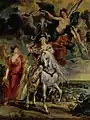 The Triumphal Entry into Paris is the culminating point of the North End of the gallery. Being the king's last major battle fought, this served as an optimal location. Rubens wanted it to be at the end of the gallery as a "large and important" piece with an advanced state of execution.[127] The painting shows Henry parading into Paris as a victorious Roman emperor holding an olive branch, the symbol of peace. However, because Henry never actually entered Paris in this fashion, the scene is supposed to represent only a symbolic triumph. Henry's action and setting (the buildings and a triumphal arch) were not really possible in Paris at this time, reassuring that the scene is not based on historical fact, but a classical metaphor and Henry's goal of remaining King of France.[128] This painting coincides with Apotheosis and Ascendancy in the Marie cycle.[129]