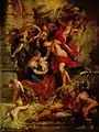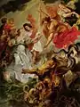Much speculation exists on the exact circumstances under which Marie de' Medici decided to commission Rubens to paint "such a grandiose project, conceived in truly heroic proportions".[2] John Coolidge suggests the cycle may have even been commissioned to rival another famous series of Rubens, The Constantine Tapestries, which he designed in his studio at the same time as the first several paintings of the Medici Cycle.[3] It has also been suggested that Rubens prepared a number of oil sketches, by the request of Louis XIII, the son of Marie de' Medici and successor to the throne, which may have influenced the Queen's decision to commission Rubens for the cycle by the end of the year 1621.[2] The immortalizing of her life, however, seems to be the most apparent reason for the Queen's choice to commission a painter who was capable of executing such a demanding task. Peter Paul Rubens had already established himself as an exceptional painter and also had the advantage of sustaining close ties with several important people of the time, including Marie de' Medici's sister, the wife of one of Rubens's first important patrons, the Duke of Gonzaga. The information about the commission in the contract Rubens signed is far from detailed and focuses mainly on the number of pictures in the cycle dedicated to the Queen's life, and is far less specific when it comes to the cycle praising her husband Henry IV.[4] The contract stated that Rubens was to paint all the figures, which presumably allowed him to employ assistants for backgrounds and details.[5]