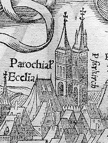 On 15 May 1826 the south tower of the church collapsed – Karl Friedrich Schinkel's rebuild completely walled off a Gothic display wall from the 13th century, which was only rediscovered during repairs in the 1990s. Schinkel entrusted his scheme to his pupil Emil Flaminius, although it did not include rebuilding the lost south tower. The church was ruined during the destruction of downtown Frankfurt in April 1945 and partially collapsed. Its sacristy and Martyrchor (Martyrs' choir) were rebuilt and the nave altar brought back into use by the parish using its own funds in 1958, but the limited heating meant services could only occur in the summer. The city council and the church signed a 99-year lease on 27 September 1974 so that it could continue using the church, with the city taking over restoration and rebuilding of the ruins for general civic purposes. This began in 1979, restoring the sacristy, and continued in 1990. The main roofs over the chancel and nave were rebuilt in 1998. Reconstruction concluded with the restoration of the original coloured façade of the north tower after colour pigments were discovered on it. Since 1980 its church furniture have been in the Sankt-Gertraud-Kirche – these include the 1489 Marienaltar, its late 14th century bronze font and bronze candlesticks and many tomb monuments and inscriptions.