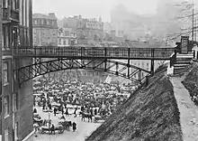 With the arrival of industrialization, Mariensztat became a site of many transformations and disparities. The Pancer Viaduct, completed in 1846, connected the Royal Castle with the Kierbedź Bridge that led to the Praga borough across the river. The sudden surge of people and visitors travelling on the viaduct to Old Town increased the potential for economic activity. In the 1860s, Samuel Orgelbrand established a printing presses at Bednarska Street, one of the most modern in Congress Poland; several other factories were set up in the vicinity which attracted more settlers. By 1865, the little market square at Mariensztat was enlarged and became an important trading place along the Vistula. New townhouses were erected around the square for the more prosperous residents, including the Matias Taubenhaus tenement, the tallest in Warsaw at the time of its completion in 1911. Nevertheless, a large portion of the neighbourhood's population was poor, and the river embankment with neighbouring Powiśle and Solec remained a dilapidated and polluted slum until World War II.