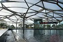 The translucent entrance canopy and the large CCL entrance are intended to maximise the amount of natural light entering the station.[67] Only the lift, escalators, the lightweight ETFE canopy and the reflective pool are visible from street level; this reduces the station's aesthetic impact on the park's landscape while giving passengers a full view of the park from the station entrance. The reflective pool was also intended to provide a smooth transition between the exits and the park.[63]